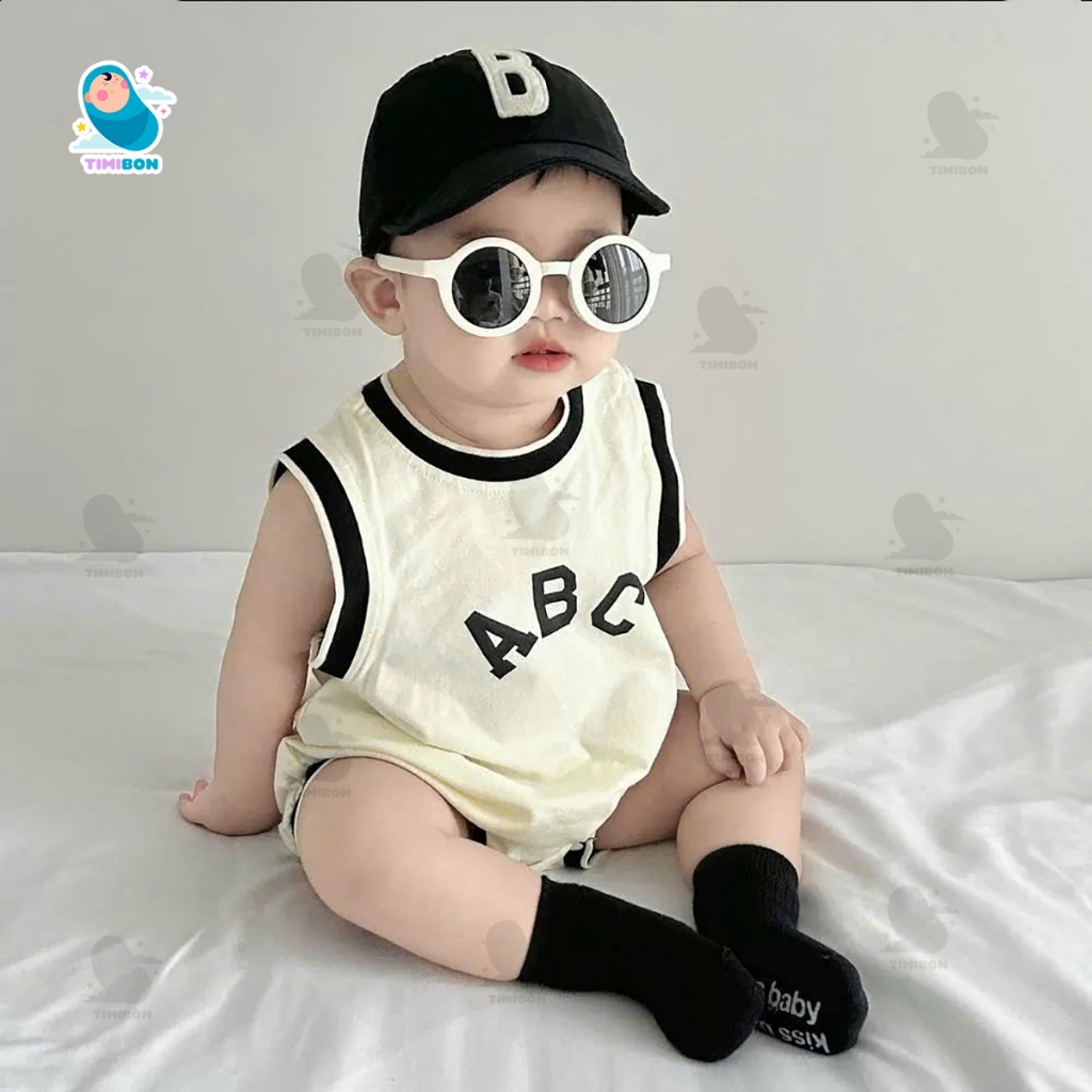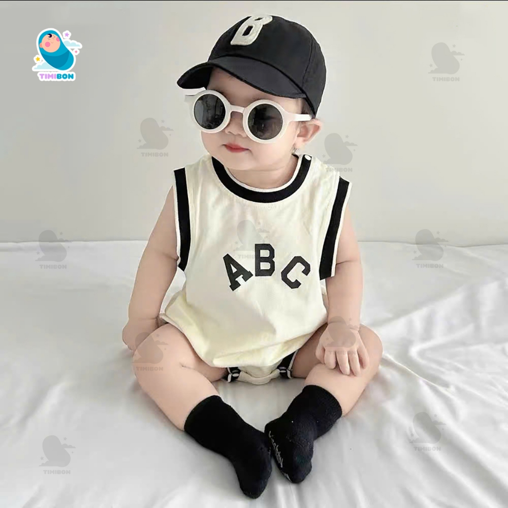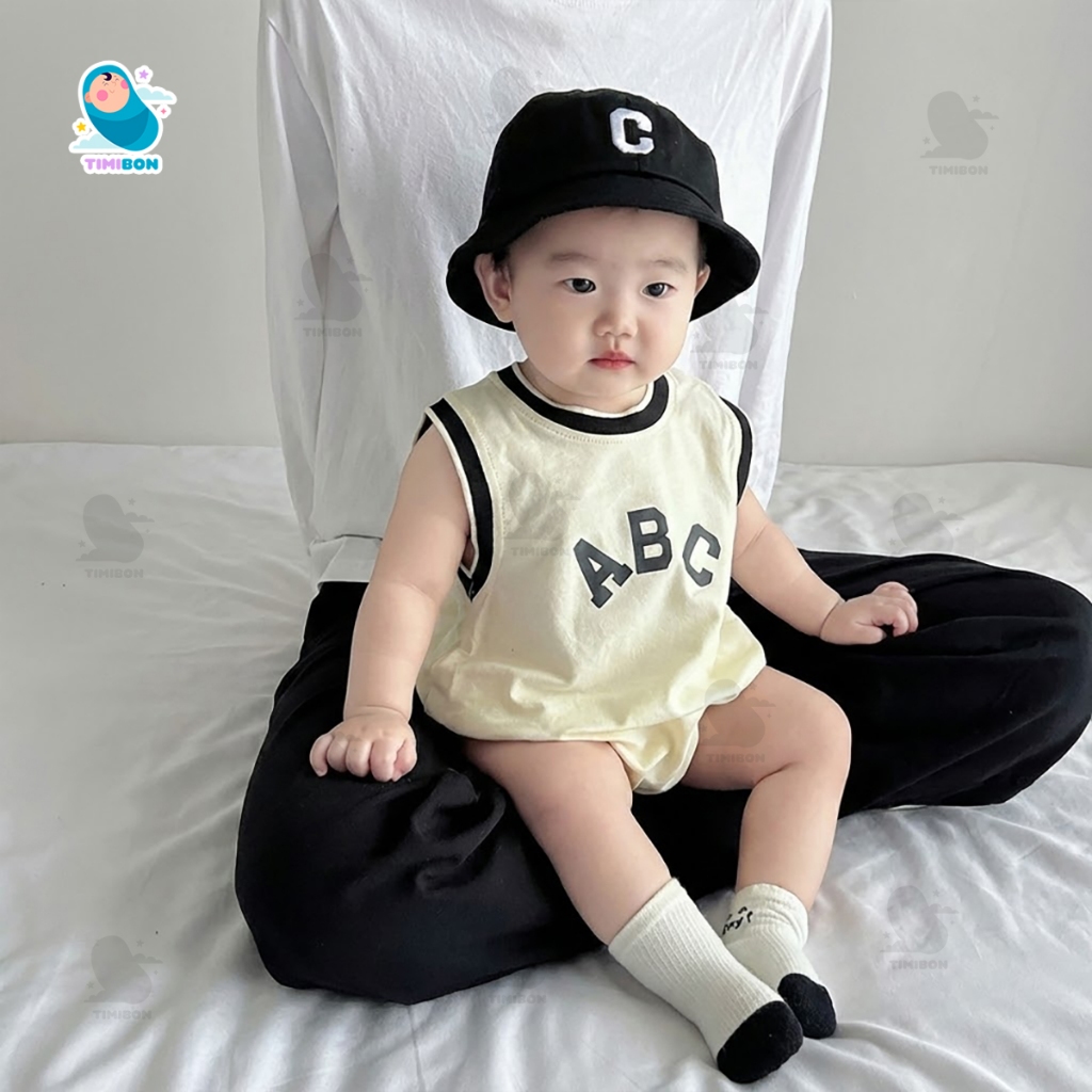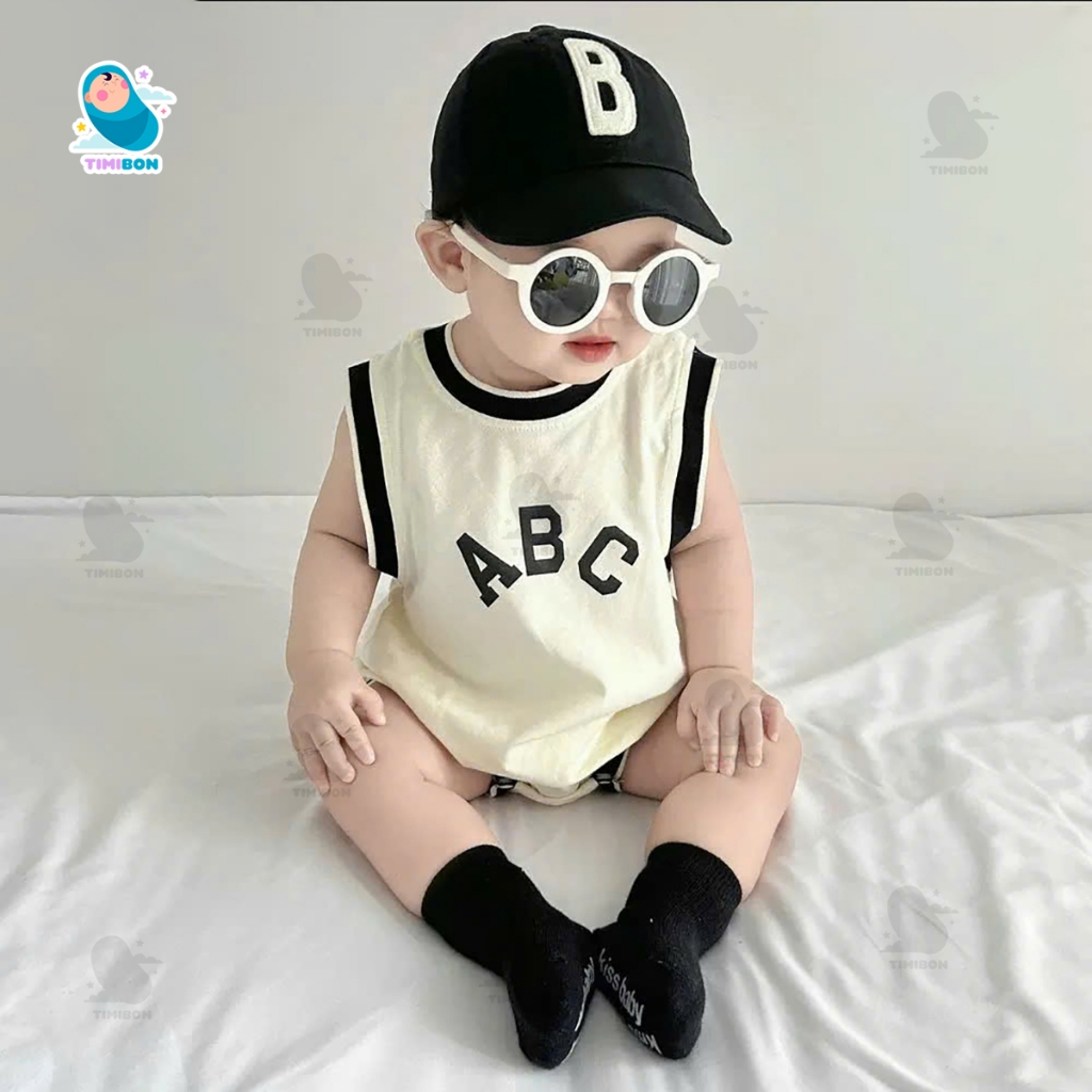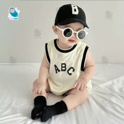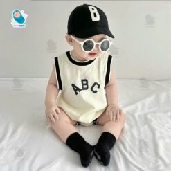 Thiết kế: Kiểu dáng body cho bé ba lỗ (sát nách) form rộng rãi, thoải mái. Viền cổ, tay và đùi được bo viền đen tương phản tạo vẻ ngoài khỏe khoắn, năng động. Họa tiết chữ “ABC” in sắc nét, tối giản nhưng rất thời trang.