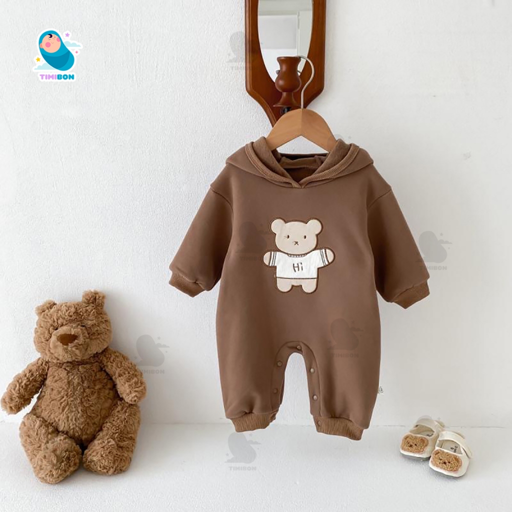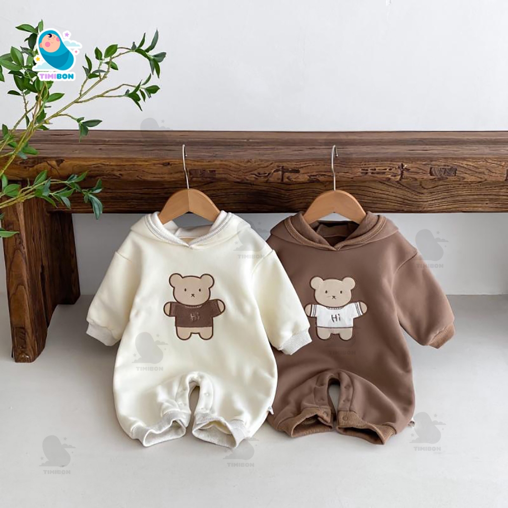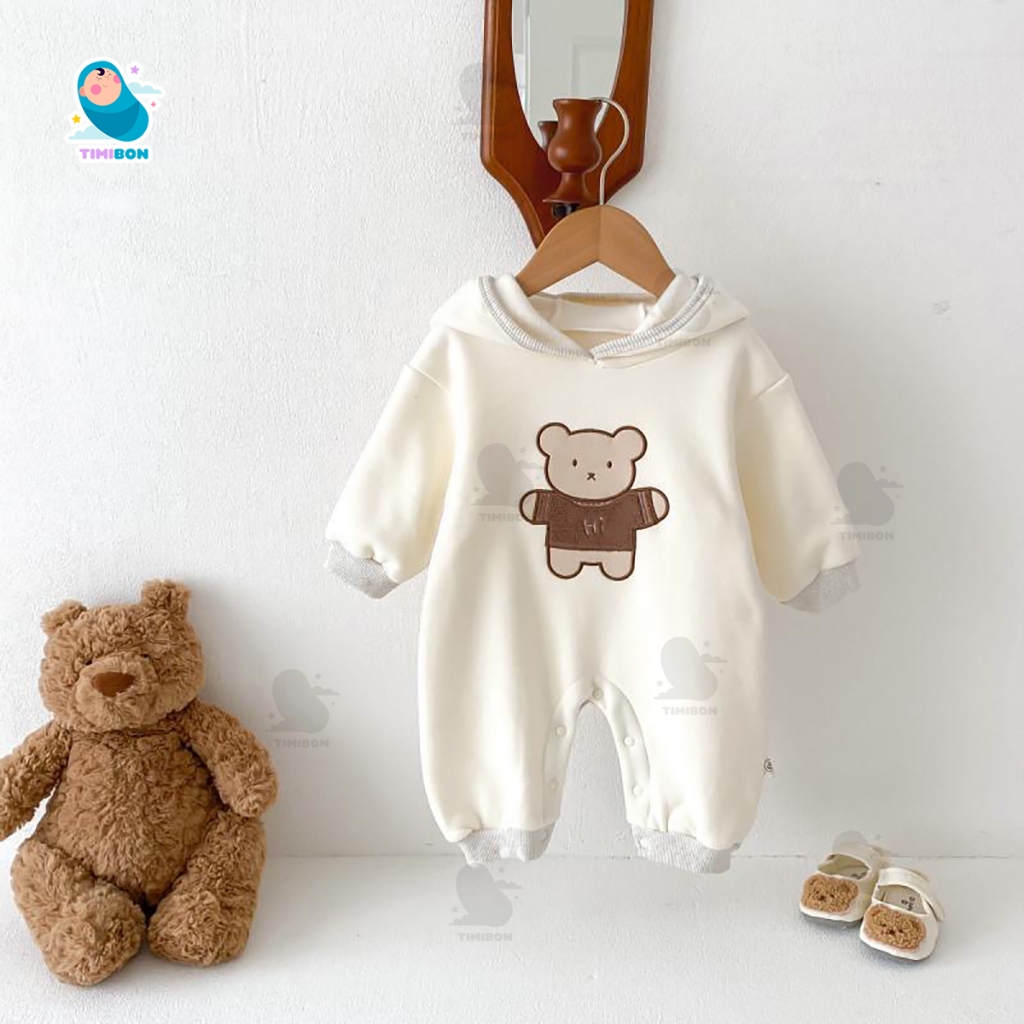 Bodysuit Dài Tay Cho Bé Trai Gái Vải Cotton Da Cá Dày Dặn Áo Liền Quần Hình Gấu Mũ Liền Trẻ Sơ Sinh – [BDD86]