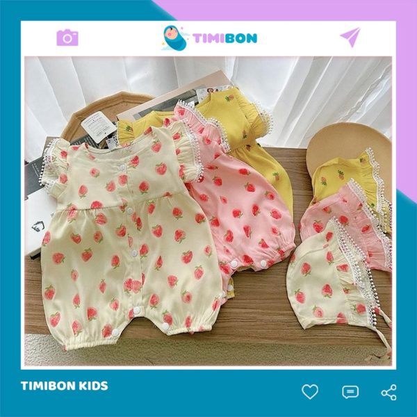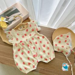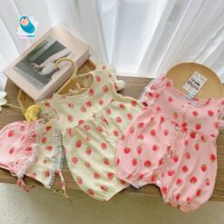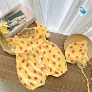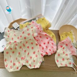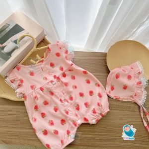 [ Tặng Kèm Mũ ] Body Đùi Cánh Tiên Trái Dâu Chất Đũi Lạnh Cho Bé Gái Sơ Sinh Mặc Hè Thoáng Mát – [BDC28]